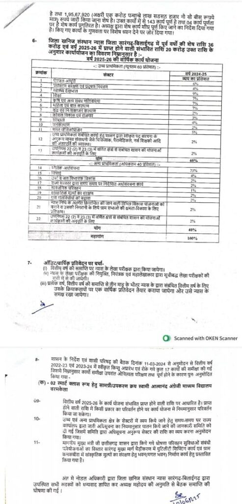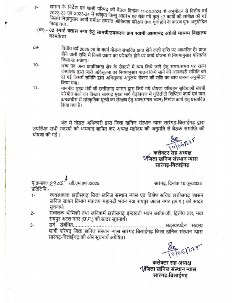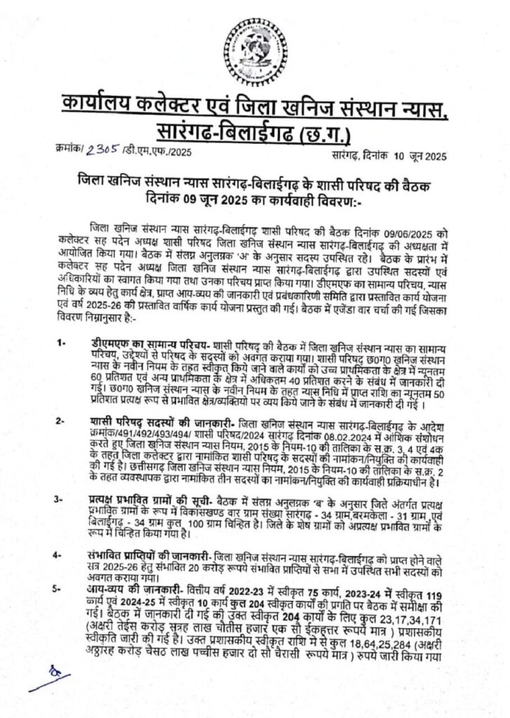 рд╕рд╛рд░рдВрдЧреЭ – рдмрд┐рд▓рд╛рдИрдЧреЭ / рд╕рд╛рд░рдВрдЧрдврд╝-рдмрд┐рд▓рд╛рдИрдЧрдврд╝ рдЬрд┐рд▓реЗ рдореЗрдВ рдПрдХ рдмрдбрд╝рд╛ рдЦреБрд▓рд╛рд╕рд╛ рд╣реЛрдиреЗ рдЬрд╛ рд░рд╣рд╛ рд╣реИред рдЦрдирди рдкреНрд░рднрд╛рд╡рд┐рдд рдХреНрд╖реЗрддреНрд░реЛрдВ рдХреЗ рд▓реЛрдЧреЛрдВ рдХреЗ рд▓рд┐рдП рдХреЗрдиреНрджреНрд░ рд╕рд░рдХрд╛рд░ рдкреНрд░рдзрд╛рдирдордВрддреНрд░реА рджреНрд╡рд╛рд░рд╛ рдмрдирд╛рдИ рдЧрдИ рдЬрд┐рд▓рд╛ рдЦрдирд┐рдЬ рдиреНрдпрд╛рд╕ рдирд┐рдзрд┐ (DMF Fund) рдХрд╛ рд╕рд╣реА рдЙрдкрдпреЛрдЧ рд╣реБрдЖ рд╣реИ рдпрд╛ рдирд╣реАрдВ тАУ рдЗрд╕ рдкрд░ рдЕрдм рд╕рд╡рд╛рд▓ рдЦрдбрд╝реЗ рд╣реЛ рдЧрдП рд╣реИрдВред