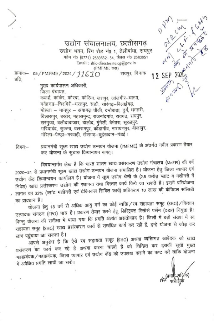 जिले की स्व-सहायता समूह की दीदियों को आत्मनिर्भर और सशक्त बनाने के लिए भारत सरकार की प्रधानमंत्री सूक्ष्म खाद्य प्रसंस्करण उद्यम (PMFME) योजना सारंगढ़-बिलाईगढ़ में तेजी से आगे बढ़ रही है। महिलाओं को इस योजना से जोड़कर खाद्य प्रसंस्करण के क्षेत्र में नए उद्योग स्थापित करने की तैयारी की जा रही है।