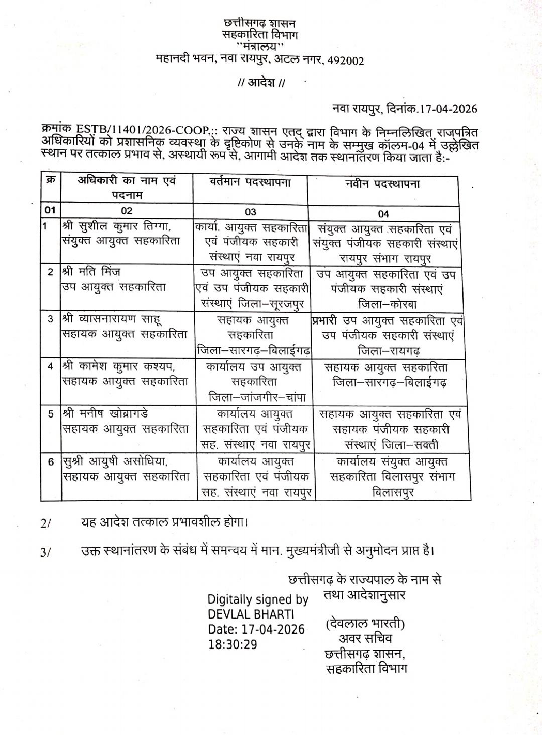 छत्तीसगढ़ शासन सहकारिता विभाग, मंत्रालय महानदी भवन नवा रायपुर से जारी आदेश ने एक बार फिर जिले के सहकारिता महकमे में हलचल मचा दी है। अवर सचिव देवलाल भारती के आदेशानुसार सहायक आयुक्त सहकारिता व्यासनारायण साहू का स्थानांतरण रायगढ़ जिले में कर दिया गया है, जबकि उनकी जगह कमलेश कुमार कश्यप को सारंगढ़-बिलाईगढ़ जिले में पदस्थ किया गया है, जो जांजगीर-चांपा जिले से यहां पहुंचे हैं।